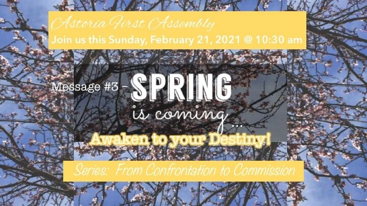 Please Join us this Sunday Morning, February 21, 2021, at 10:30 AM, for our Worship Service at Astoria 1st Assembly of God. Pastor Nick and Janice Buhler will share Message: #3 “Spring is Coming...Awaken to your Destiny” in their series for the month of February -- From Confrontation to Commission!